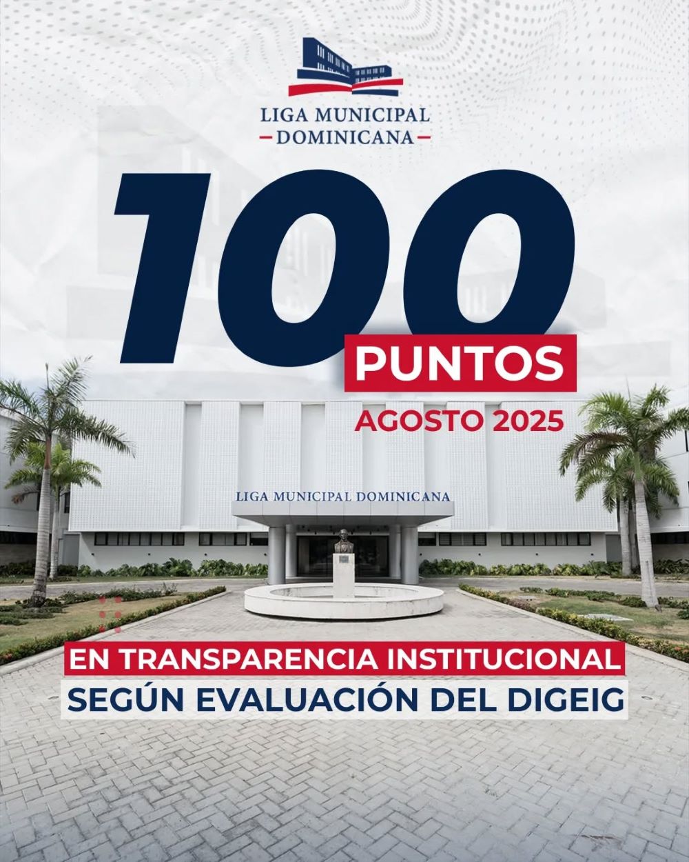La Liga Municipal Dominicana, presidida por Víctor D’Aza, obtuvo de puntuación en el monitoreo y evaluación de los Portales de Transparencia, durante el mes de agosto del presente año 2025, que realiza la Dirección General de Ética e Integridad Gubernamental