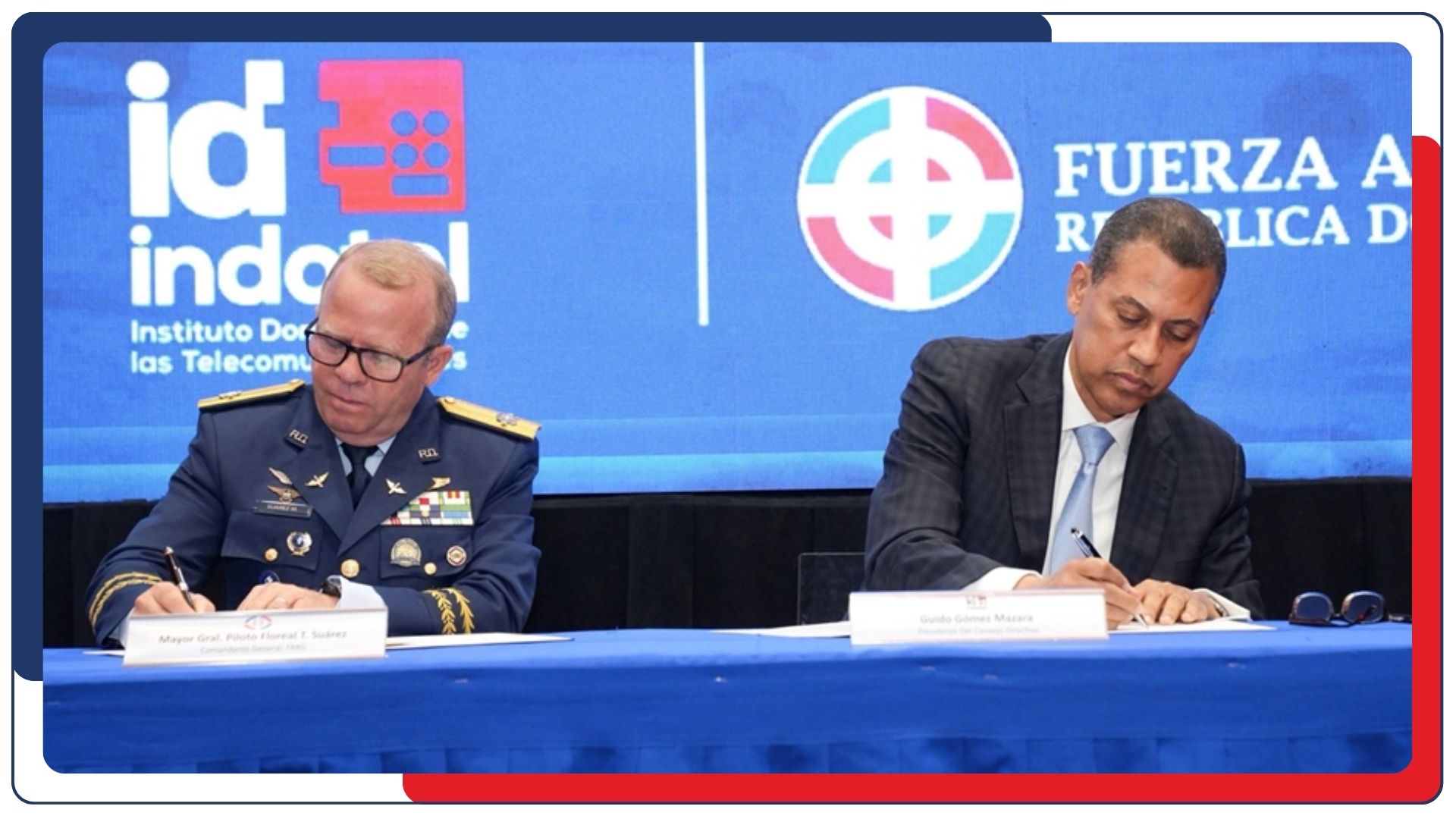 El convenio fue suscrito por el presidente del Consejo Directivo de Indotel, Guido Gómez Mazara, y el comandante general de la Fuerza Aérea de República Dominicana, mayor general piloto Floreal Suárez Martínez.