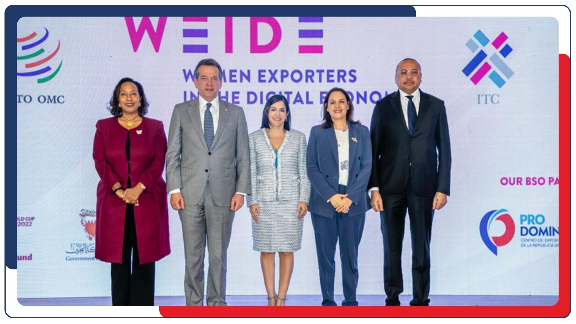 La Secretaría de la Organización Mundial del Comercio (OMC) representada por Johanna Hill, Directora General Adjunta; y el Centro de Comercio Internacional (ITC); representado por Pamela Coke-Hamilton, Directora Ejecutiva, en alianza con el Centro de Exportación e Inversión de la República Dominicana (ProDominicana), representado por su Directora Ejecutiva, Biviana Riveiro Disla, con la presencia del Ministro Victor Bisonó, Ministro de Industria Comercio y Mipypmes (MICM), presentaron oficialmente el Fondo para Mujeres Exportadoras en la Economía Digital (WEIDE, por sus siglas en inglés) en República Dominicana con el objetivo de incrementar la participación femenina dominicana en el comercio internacional.